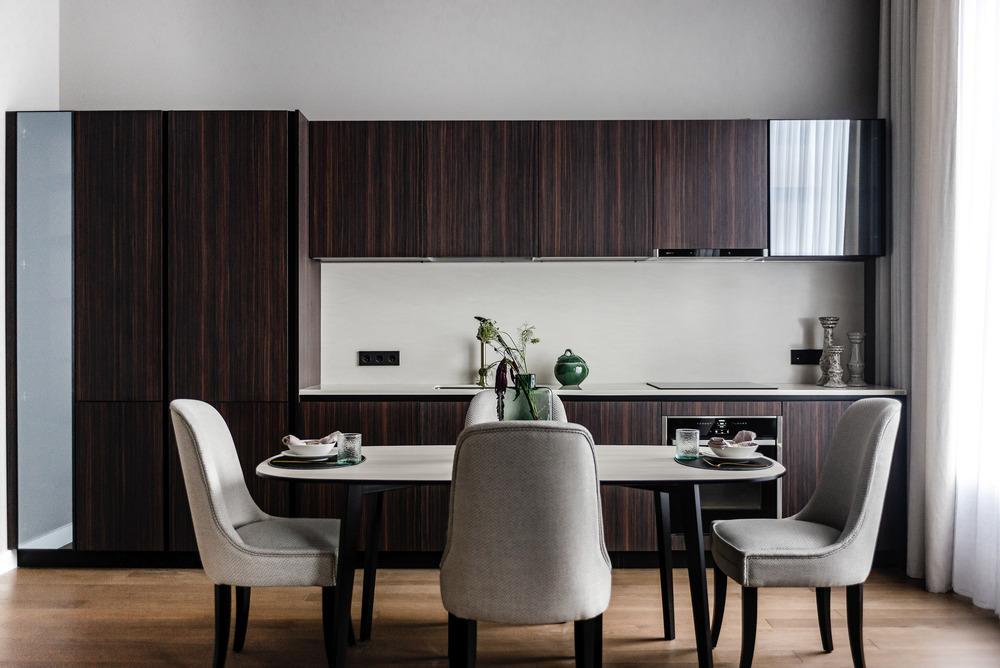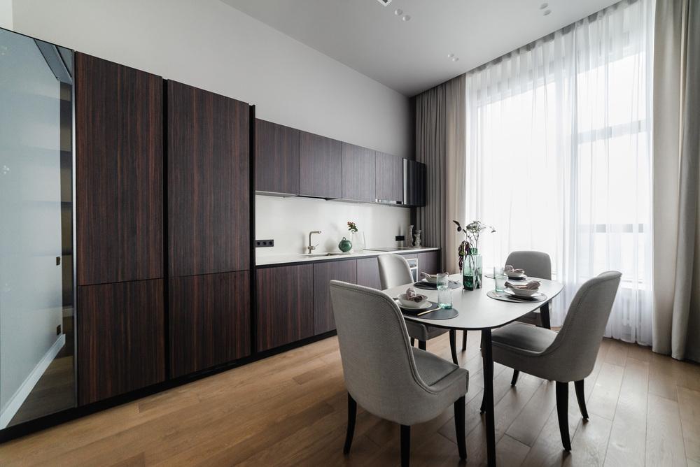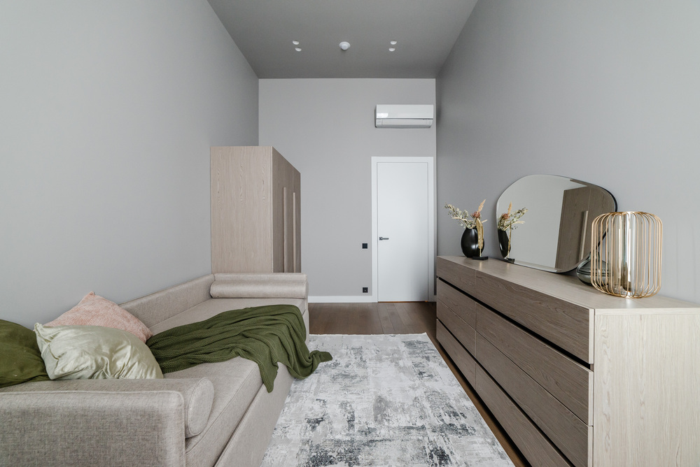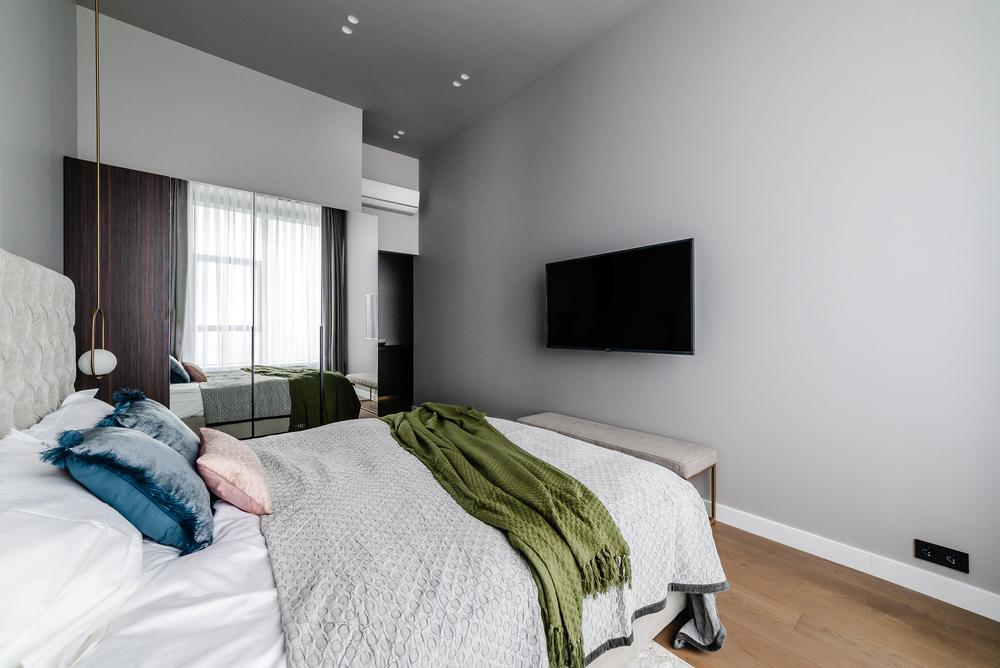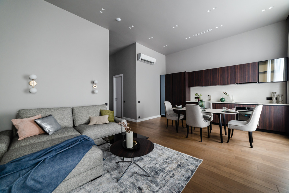 Интерьер выполнен в нейтральной цветовой гамме. Жилье оборудовано всем необходимым: кухня оснащена встроенной бытовой техникой (холодильник, варочная панель, духовой шкаф), а в комнатах установлены кондиционеры.