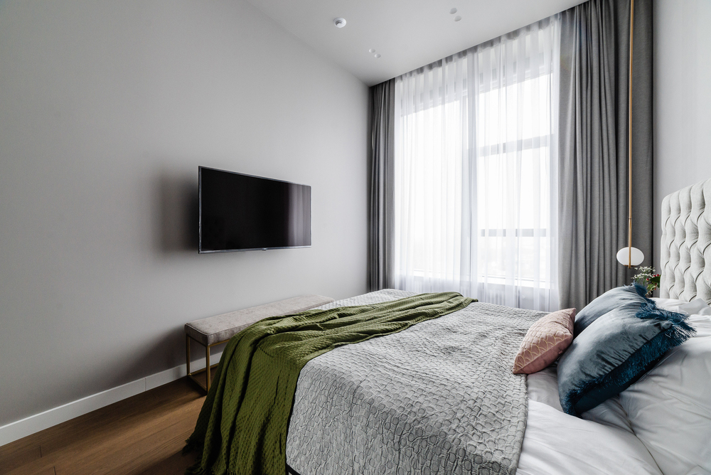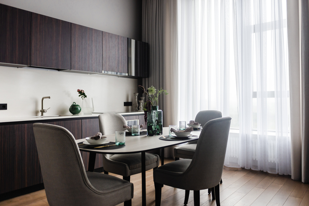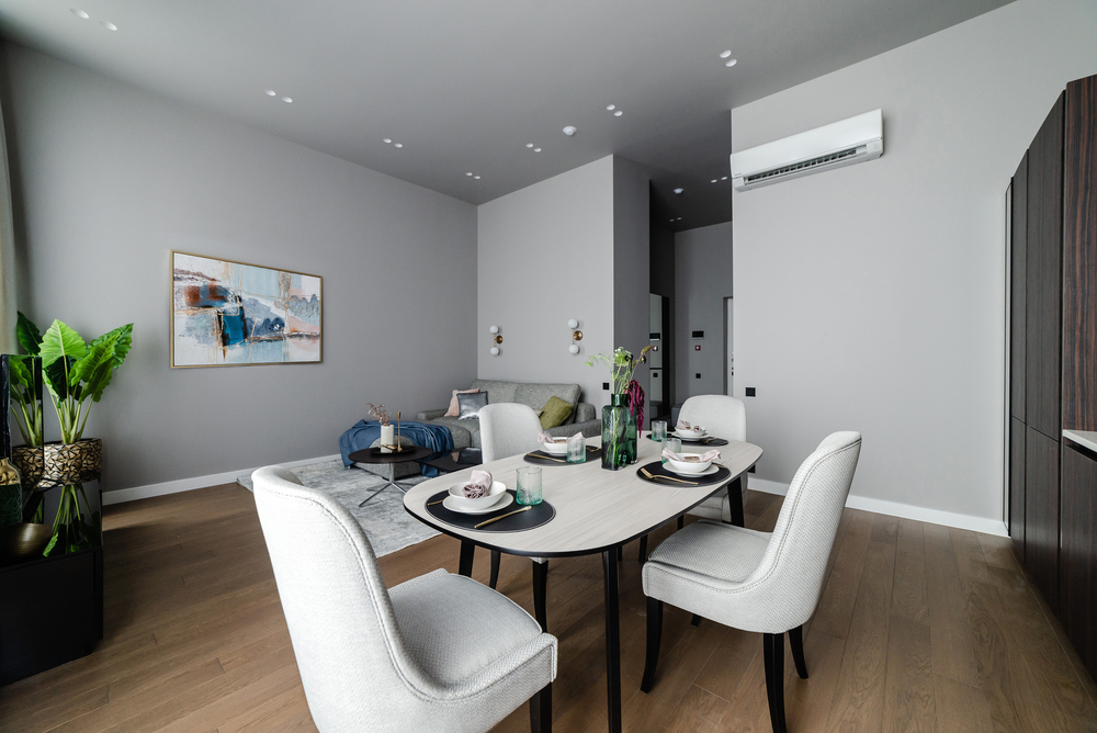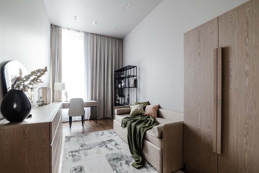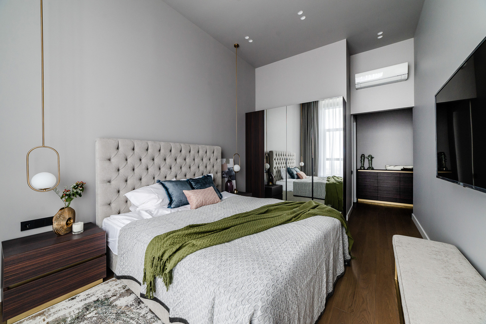 Интерьер выполнен в нейтральной цветовой гамме. Жилье оборудовано всем необходимым: кухня оснащена встроенной бытовой техникой (холодильник, варочная панель, духовой шкаф), а в комнатах установлены кондиционеры.