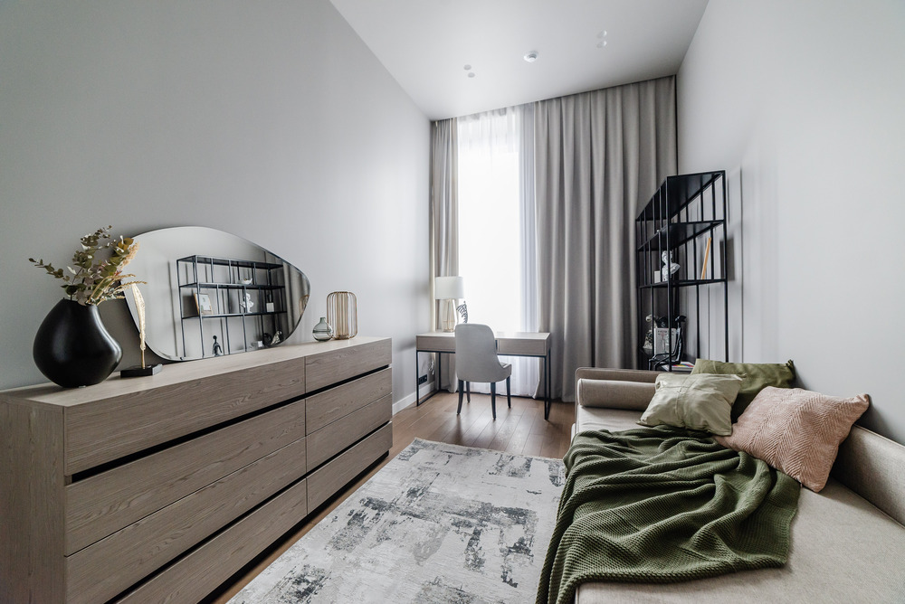 Из мебели — шкафы, кровати и тумбочки, диван, обеденная группа, письменные столы, встроенная кухня.