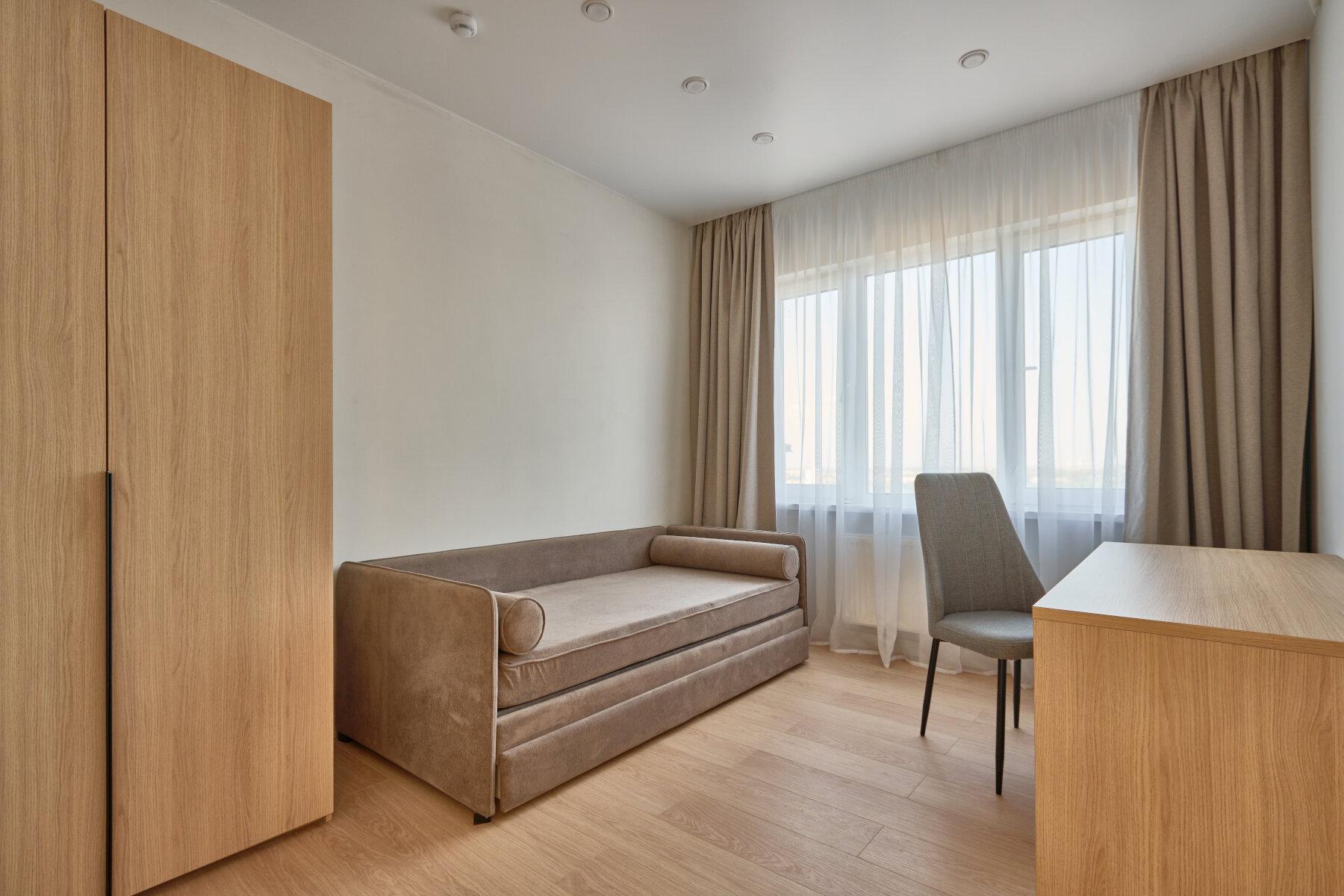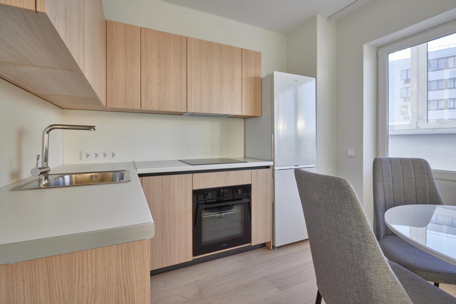 Интерьер выполнен в нейтральной цветовой гамме. Жилье оборудовано всем необходимым: кухня оснащена встроенной бытовой техникой (холодильник, варочная панель, духовой шкаф), а в комнатах установлены кондиционеры.