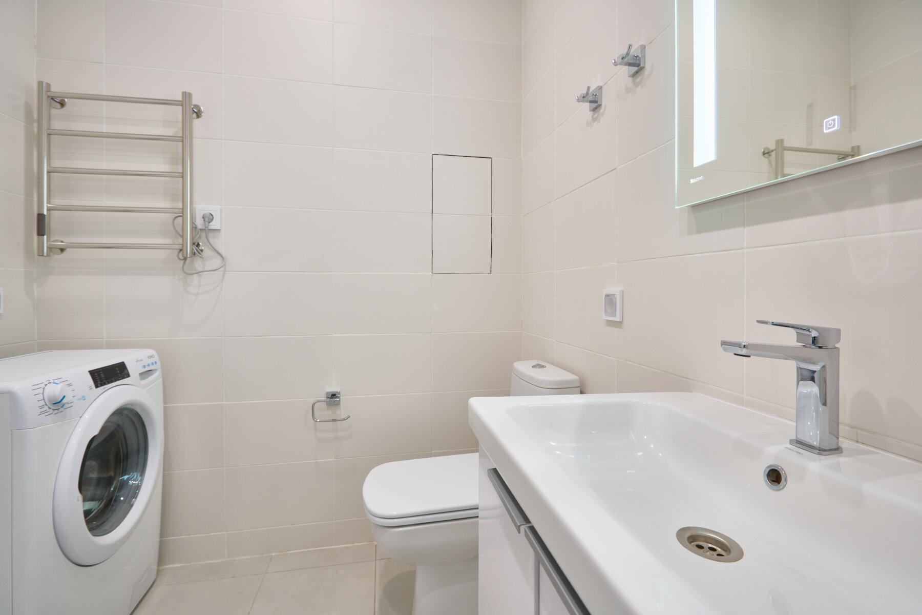 Интерьер выполнен в нейтральной цветовой гамме. Жилье оборудовано всем необходимым: кухня оснащена встроенной бытовой техникой (холодильник, варочная панель, духовой шкаф), а в комнатах установлены кондиционеры.