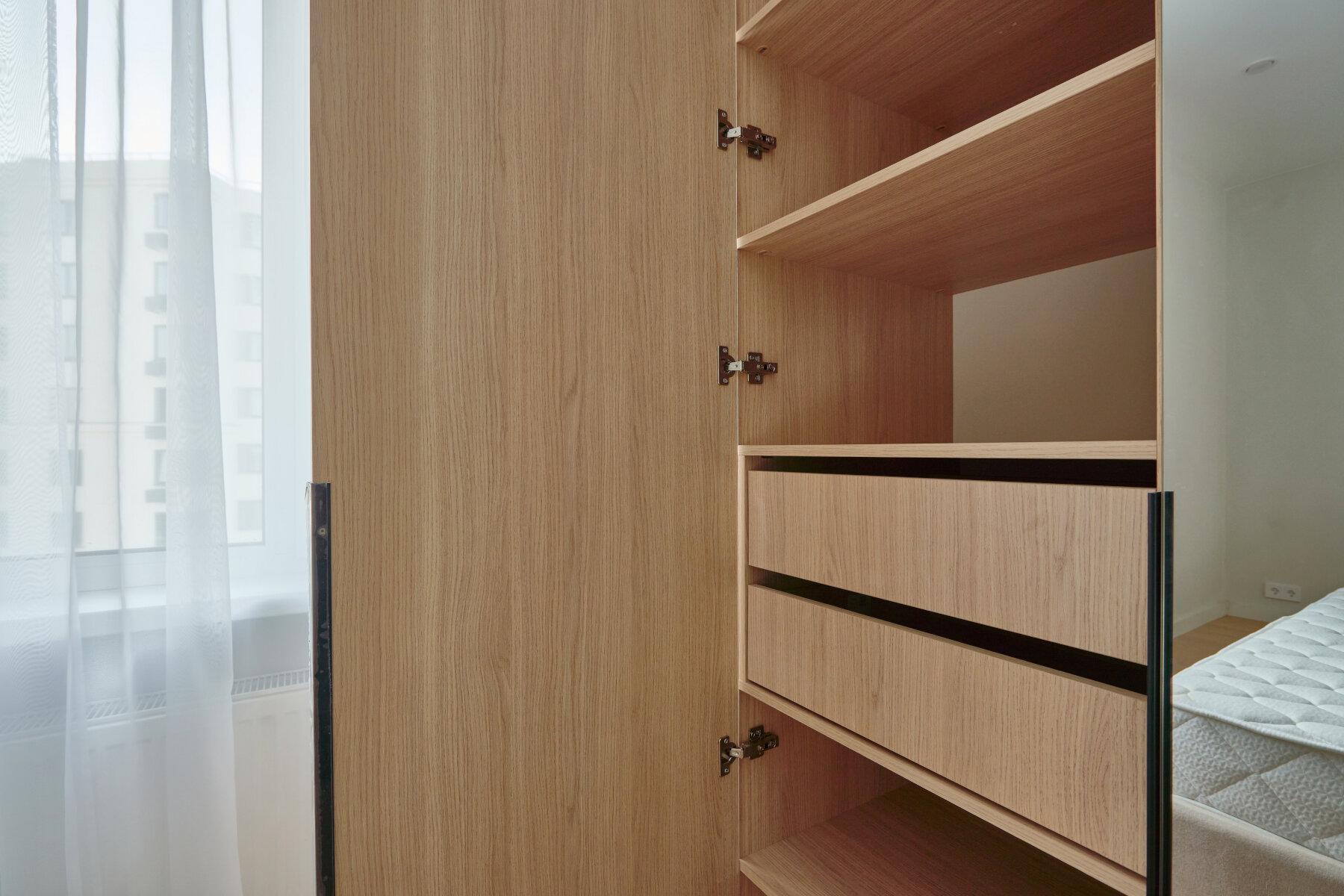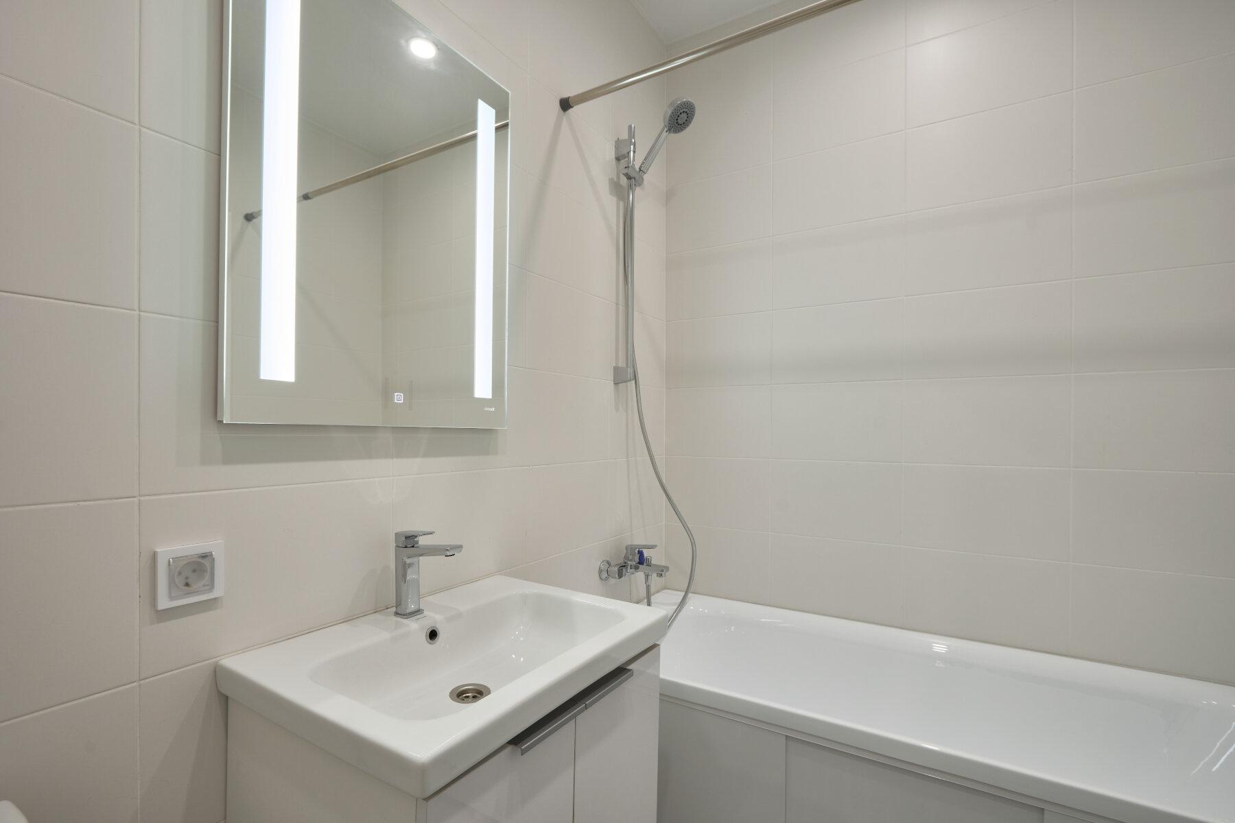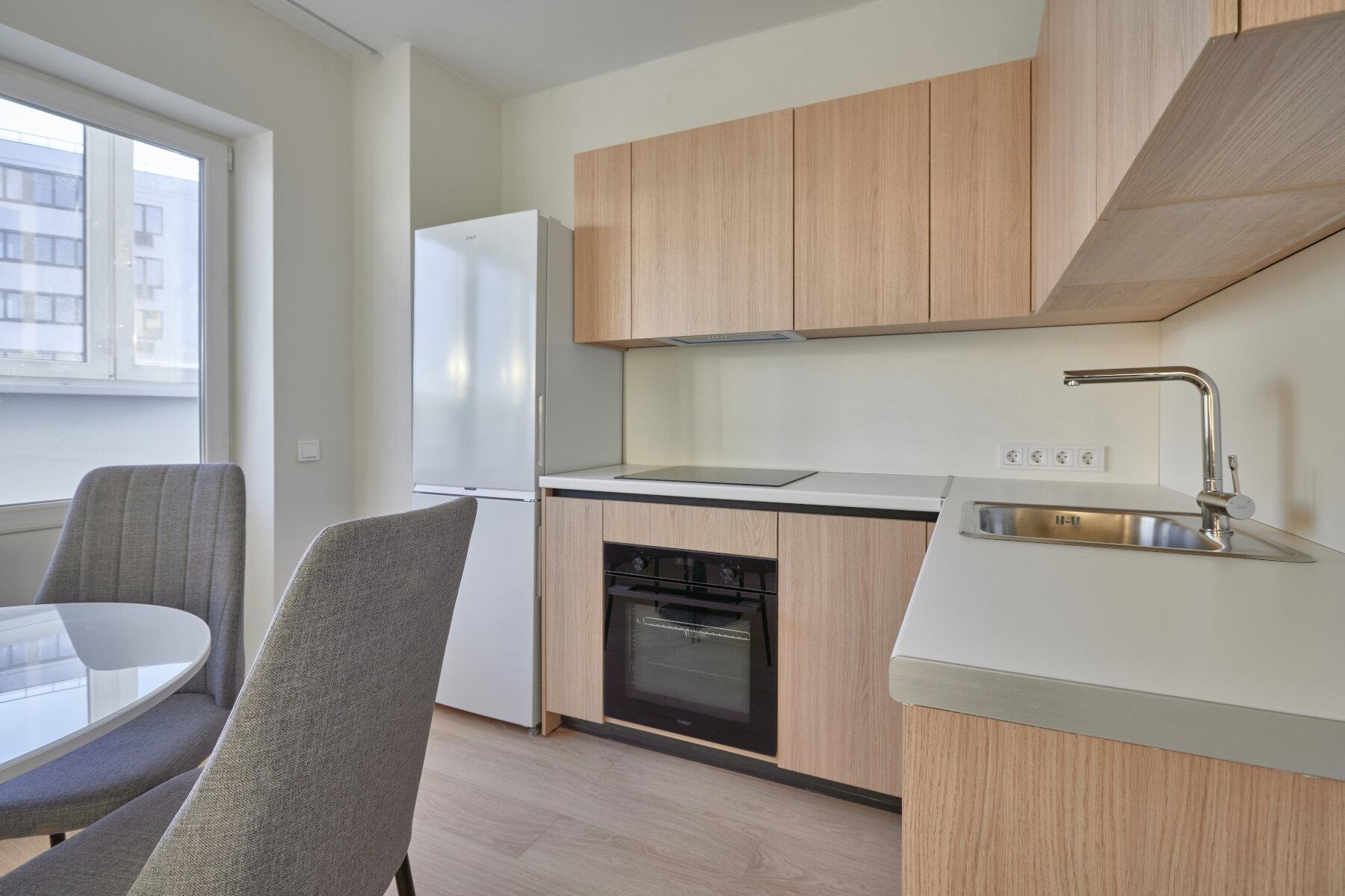 Интерьер выполнен в нейтральной цветовой гамме. Жилье оборудовано всем необходимым: кухня оснащена встроенной бытовой техникой (холодильник, варочная панель, духовой шкаф), а в комнатах установлены кондиционеры.