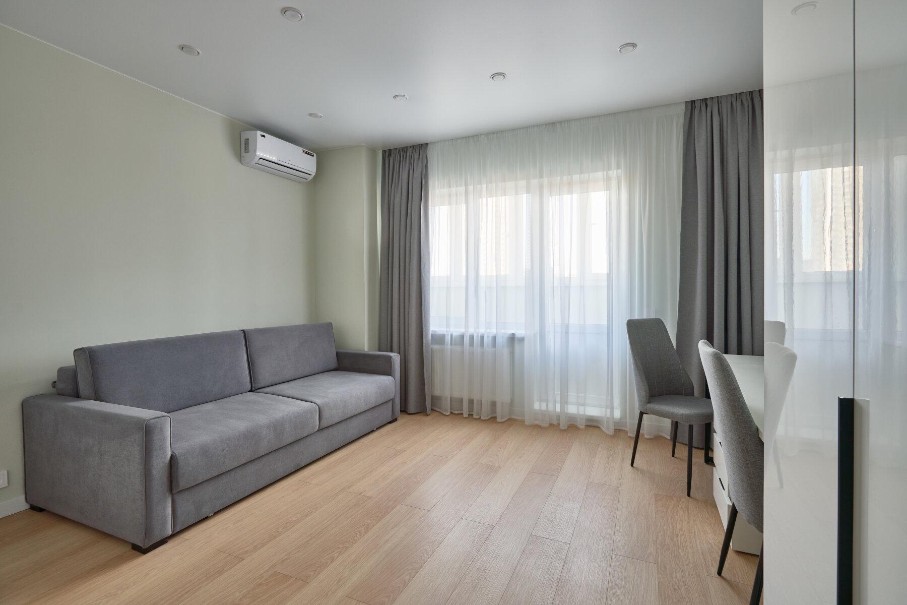 Интерьер выполнен в нейтральной цветовой гамме. Жилье оборудовано всем необходимым: кухня оснащена встроенной бытовой техникой (холодильник, варочная панель, духовой шкаф), а в комнатах установлены кондиционеры.