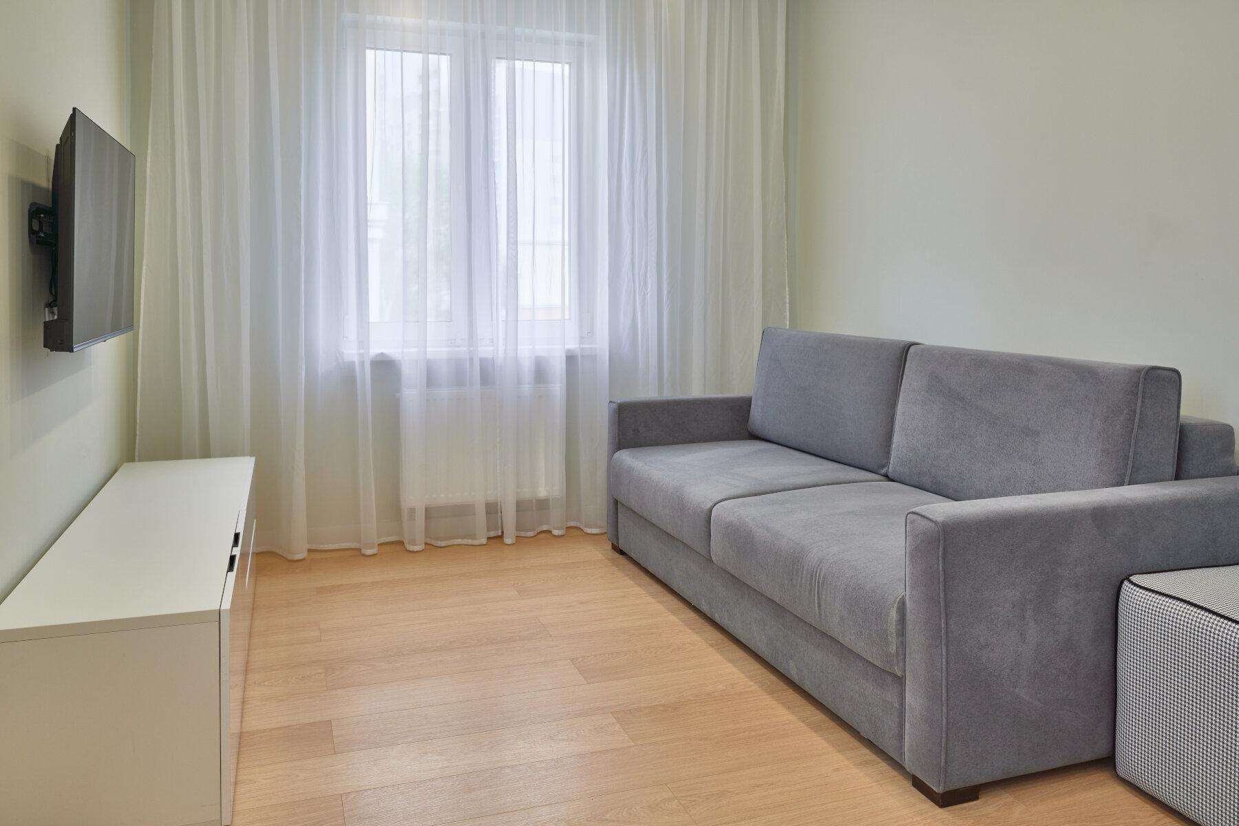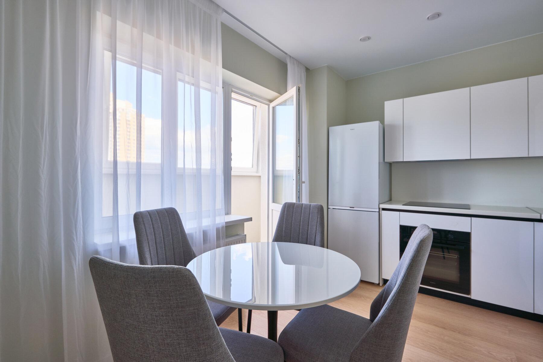 Интерьер выполнен в нейтральной цветовой гамме. Жилье оборудовано всем необходимым: кухня оснащена встроенной бытовой техникой (холодильник, варочная панель, духовой шкаф), а в комнатах установлены кондиционеры.