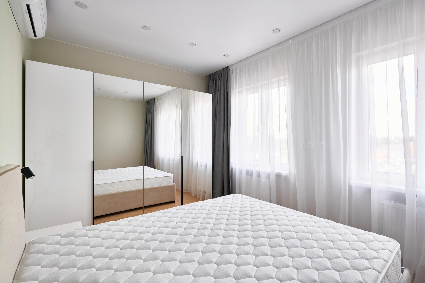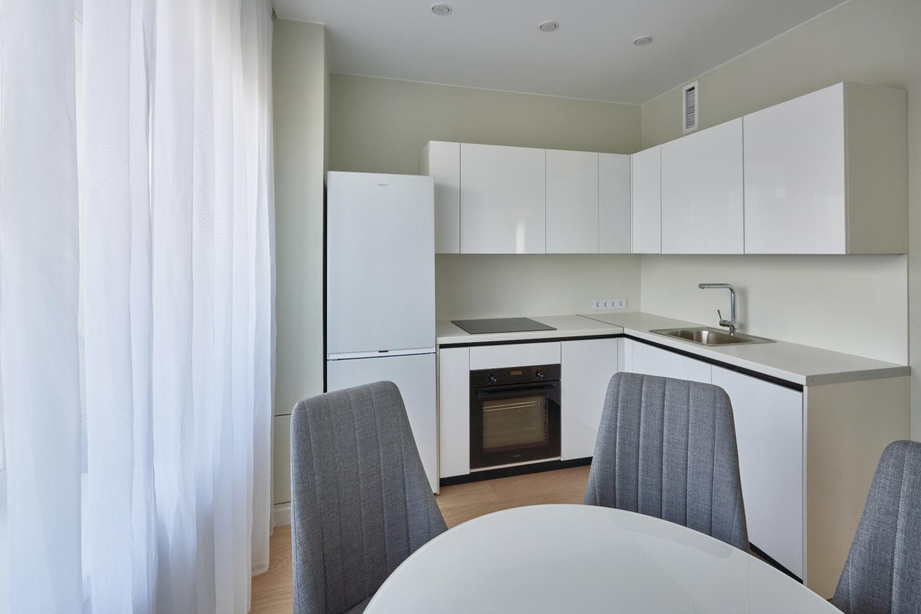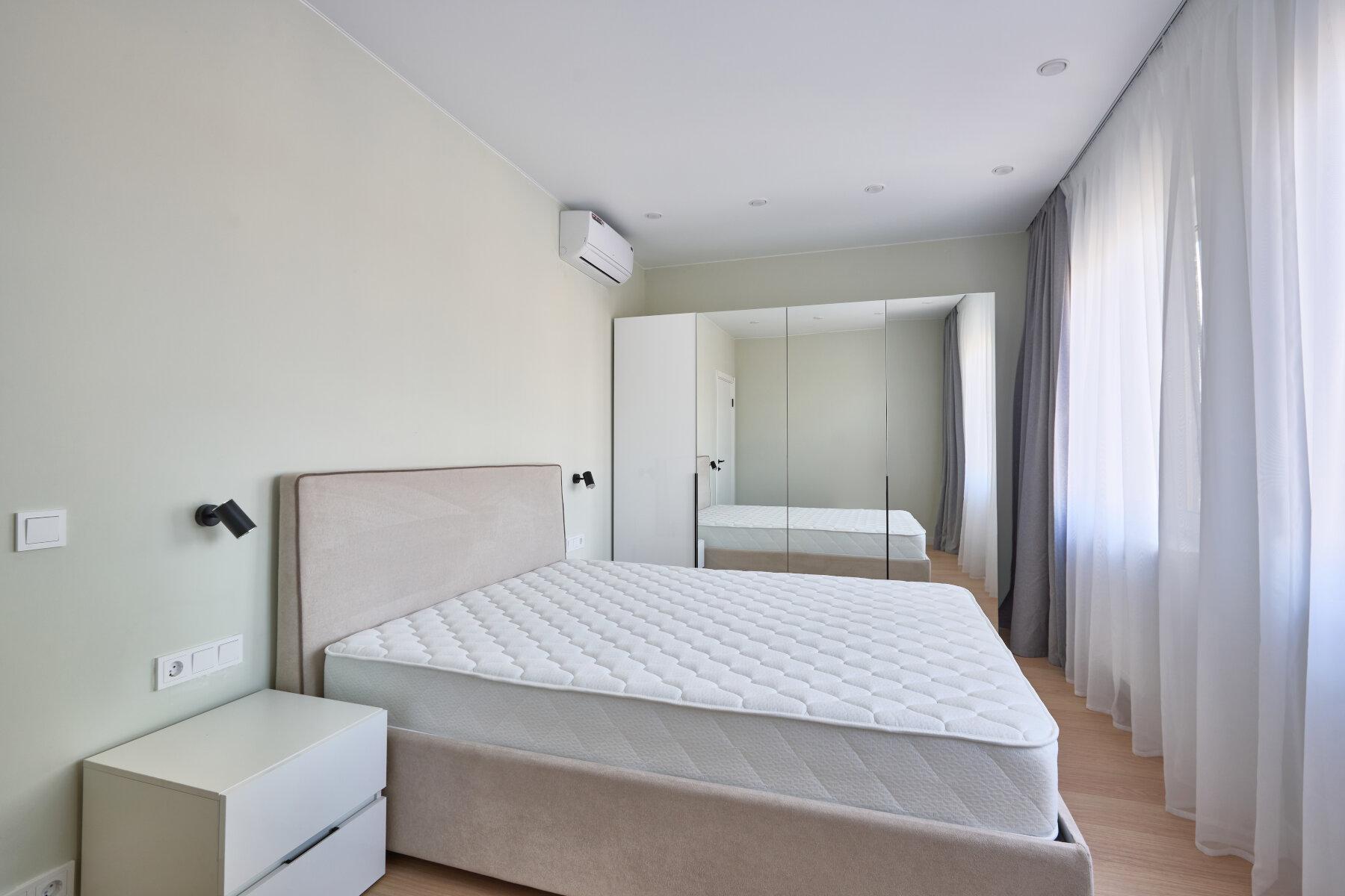 Интерьер выполнен в нейтральной цветовой гамме. Жилье оборудовано всем необходимым: кухня оснащена встроенной бытовой техникой (холодильник, варочная панель, духовой шкаф), а в комнатах установлены кондиционеры.